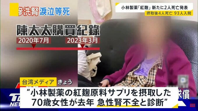 台湾メディアは28日、「小林製薬の紅麹が原料のサプリメントを摂取していた70歳の女性が2023年、急性腎不全と診断されていた」と報道。