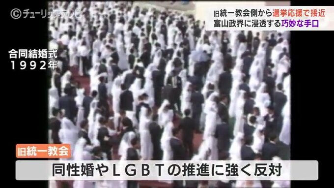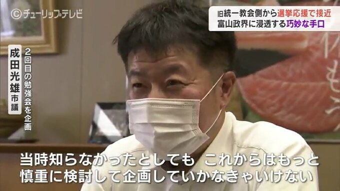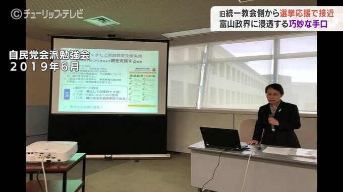 富山市議会をめぐっては、2019年と今年1月の2回にわたって自民党が旧統一教会の関連団体、国際勝共連合幹部の青津和代氏を講師に招いて、勉強会を開催していたことがチューリップテレビの取材でわかっています。