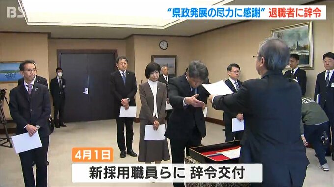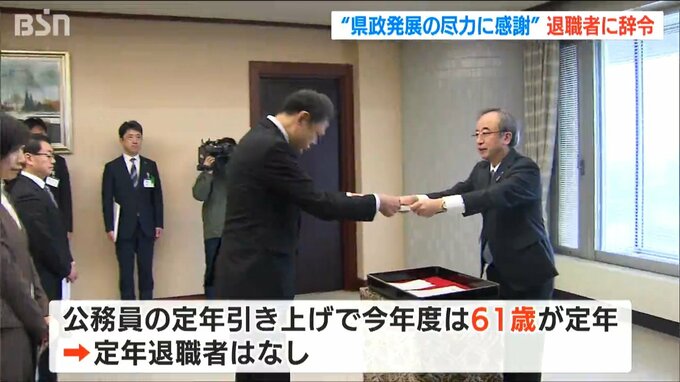 3月31日付けで退職する県職員は、県立病院の看護師などを含めて全体で412人。公務員の定年の段階的な引き上げに伴い、今年度は61歳が定年となったため、定年での退職者はおらず、退職者の数は昨年度と比べて110人少なくなっています。辞令を受け取った職員は長年の仕事を振り返っていました。