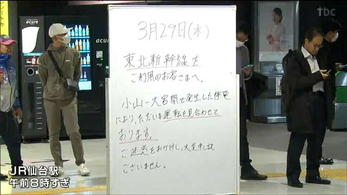 JR東日本によりますと東北新幹線は29日午前6時前、大宮駅と小山駅の間で停電が発生し東京駅と仙台駅の間の上下で始発から運転を見合わせました。
