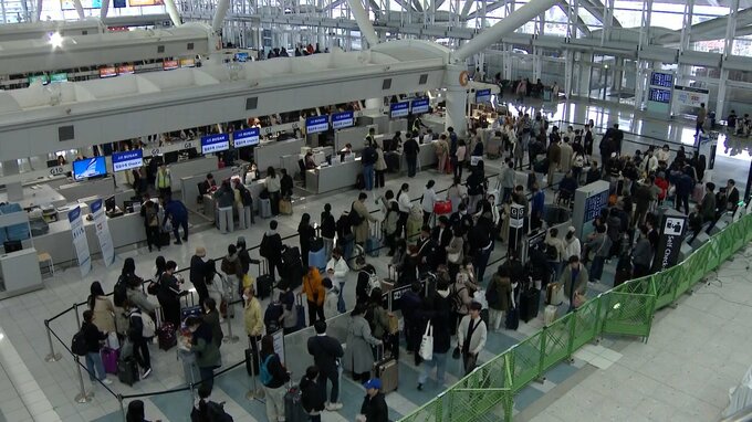 多くの旅行客でにぎわう福岡空港の国際線ロビー。春休みを利用して海外に出かける人も少なくないようです。