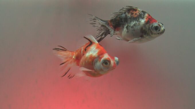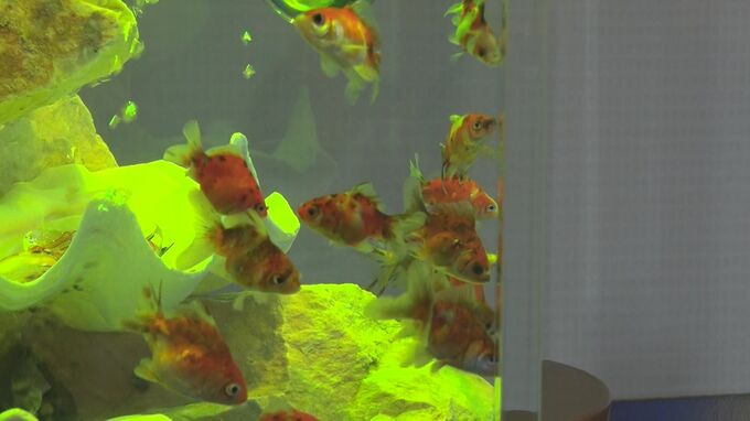 北中城村のイオンモール沖縄ライカムで3月29日から始まった「沖縄金魚ミュージアム」。70余り配置された水槽の中を38種類およそ1000匹の金魚が優雅に泳いでいます。