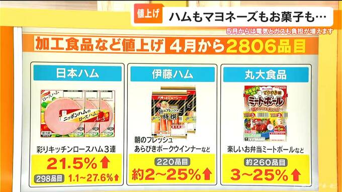 (山内彩加アナウンサー)帝国データバンクの調べによりますと、4月から2806品目が値上げするということで、ハムやソーセージといった加工食品が、特に今回値上げとなります。具体例を見ていきますと、日本ハムの…