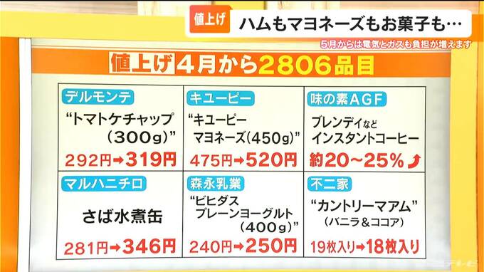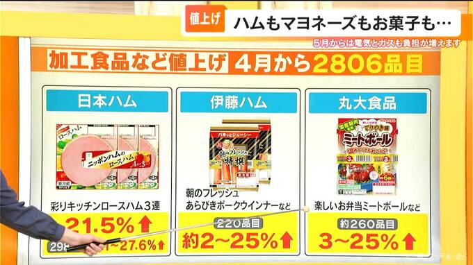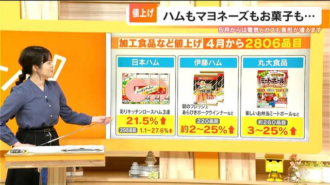 帝国データバンクの調べによりますと、4月から2806品目が値上げするということで、ハムやソーセージといった加工食品が、特に今回値上げとなります。