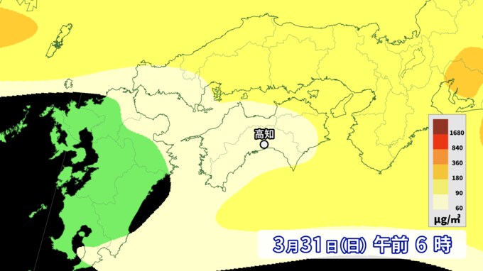 29日金曜日の夜から高知県で黄砂が予想され、特に土曜日に黄砂の量が多くなりそうです。場所によっては水平方向の見通しが5キロメートル以下となり、交通機関に影響が出るおそれがあります。31日日曜日の夕方には黄砂は抜けていく予想です。