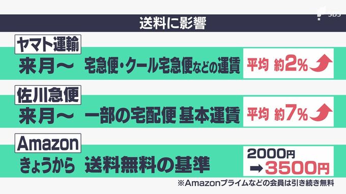 暮らしへの影響のひとつに送料の値上げがあります。ヤマト運輸は2%佐川急便は7%、一部の送料を値上げします。また、アマゾンは送料が無料となる基準を2,000円から3,500円に引き上げます。