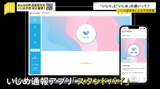 谷山さんが専門家らと作ったいじめ通報アプリ「スタンドバイ」です。子どもたちはアプリを通して、匿名で教育委員会などに通報や相談ができます。