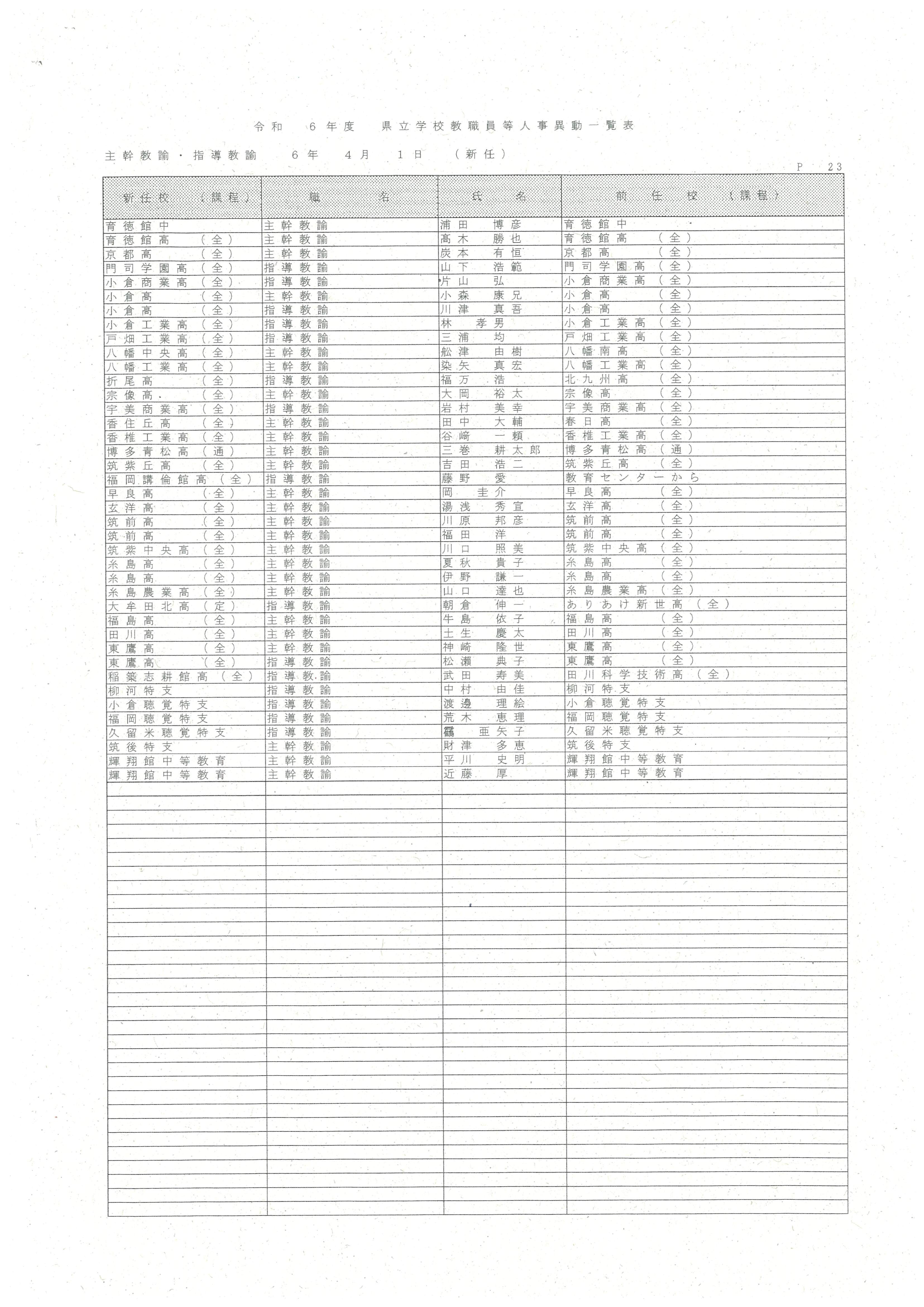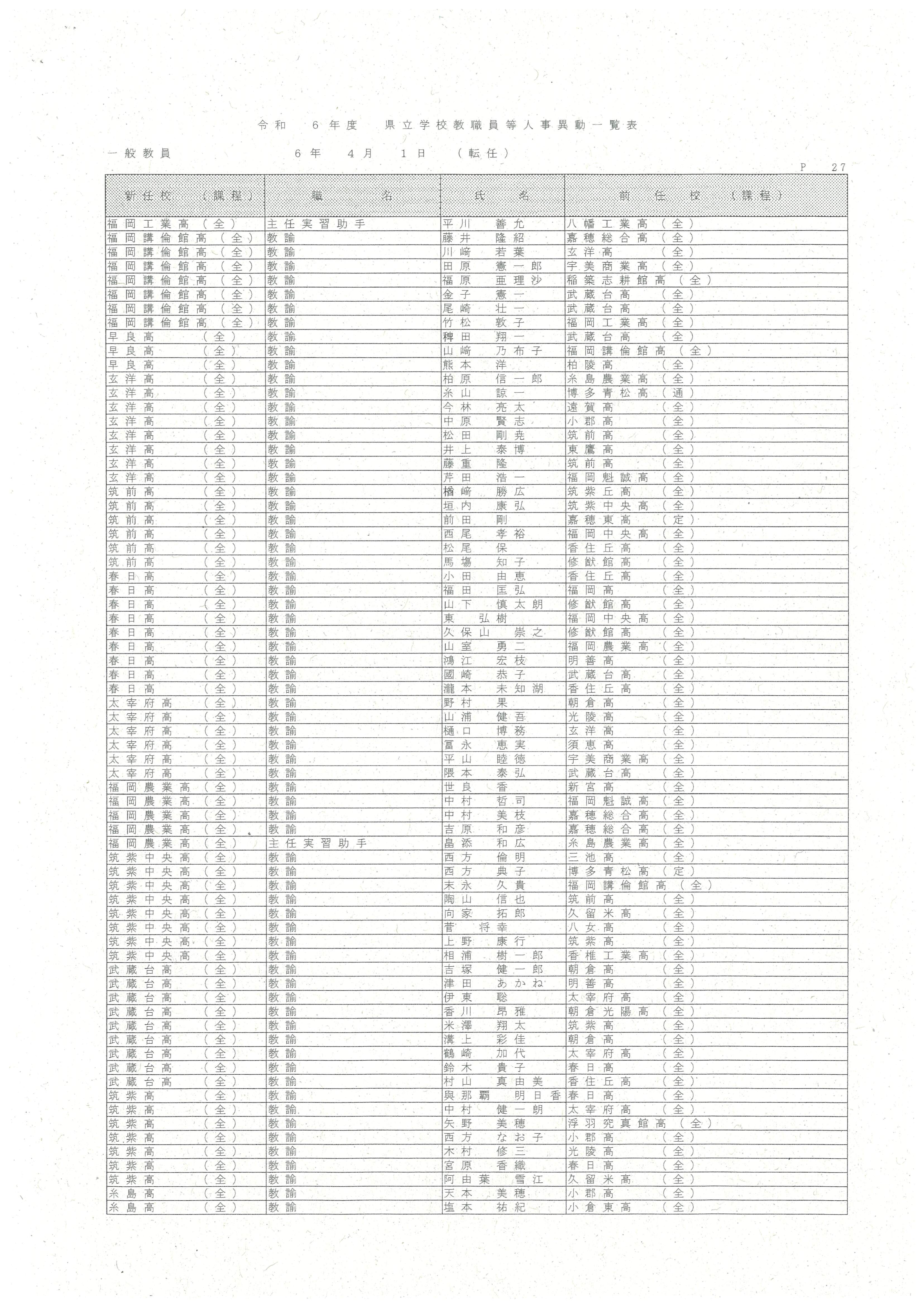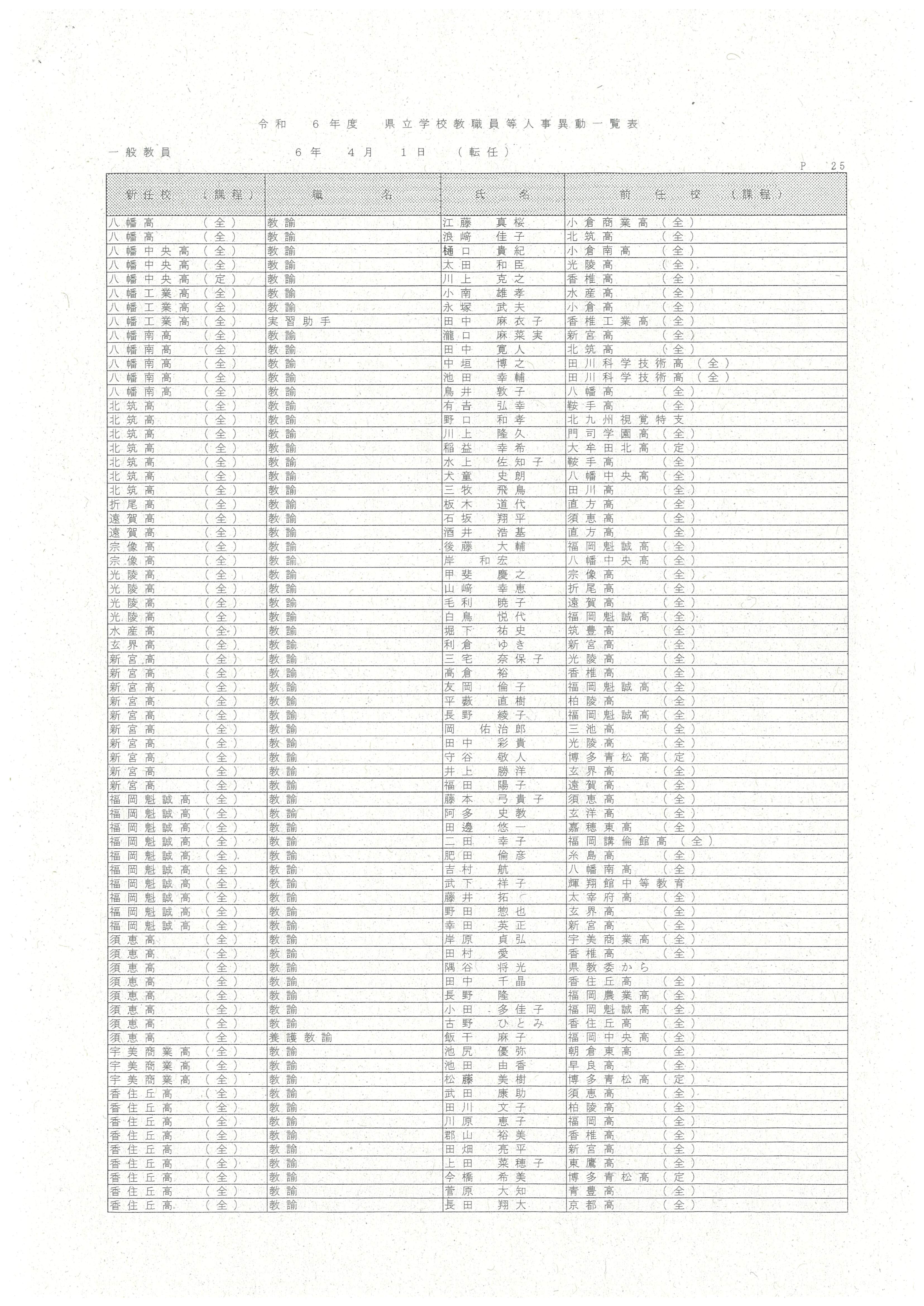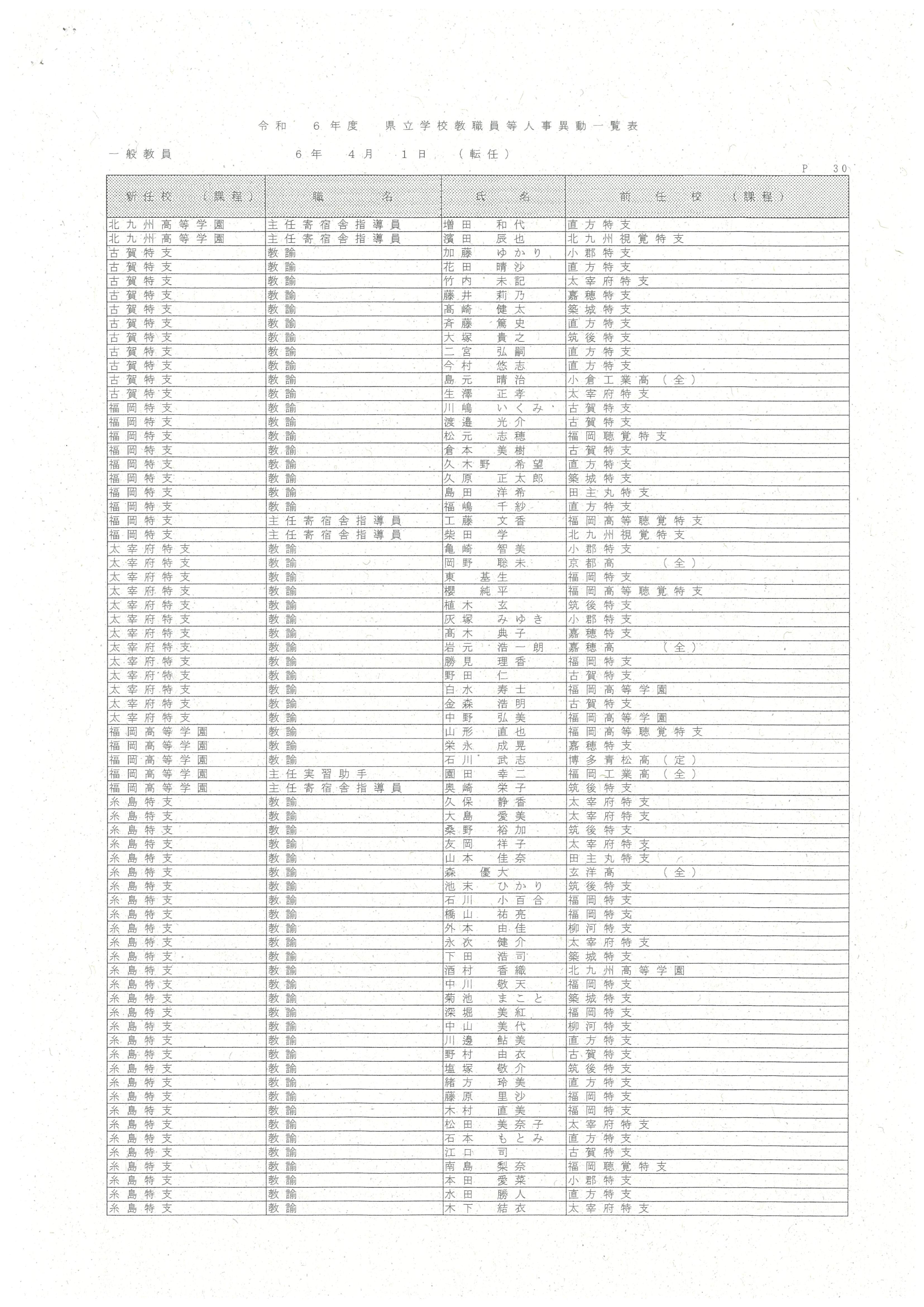 福岡県教職員人事異動2024「あの先生は今どこに?」 小学校・中学校・高校・特別支援学校【全件掲載】 RKB毎日放送 2024年4月1日(月) 00:00 国内 ◆県立学校(高校・特別支援学校など)② 以上。 ◆その他リンク ▼福岡市教職員人事異動2024【全件掲載】 ▼北九州市教職員人事異動2024【全件掲載】 ▼佐賀県教職員人事異動2024【全件掲載】