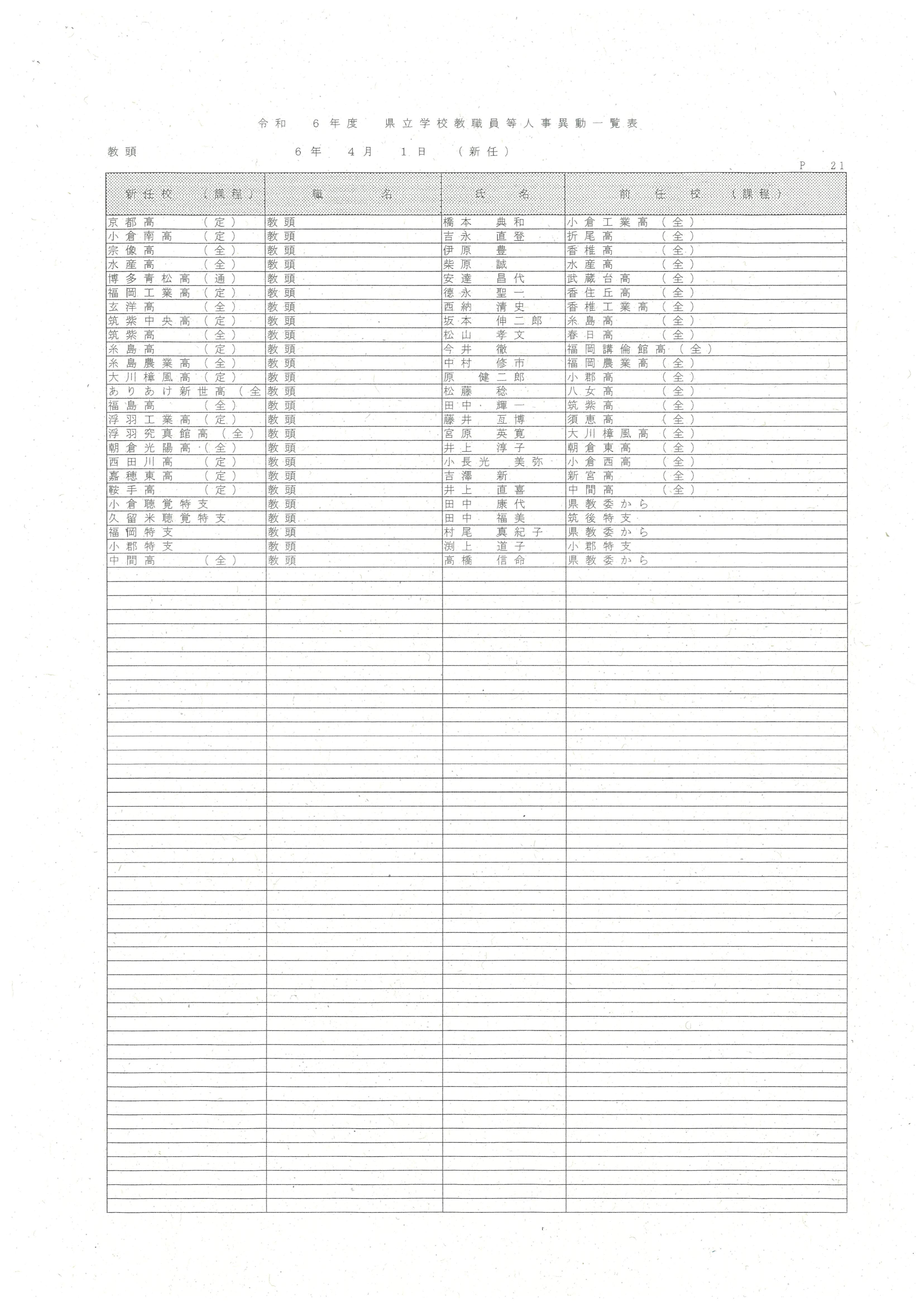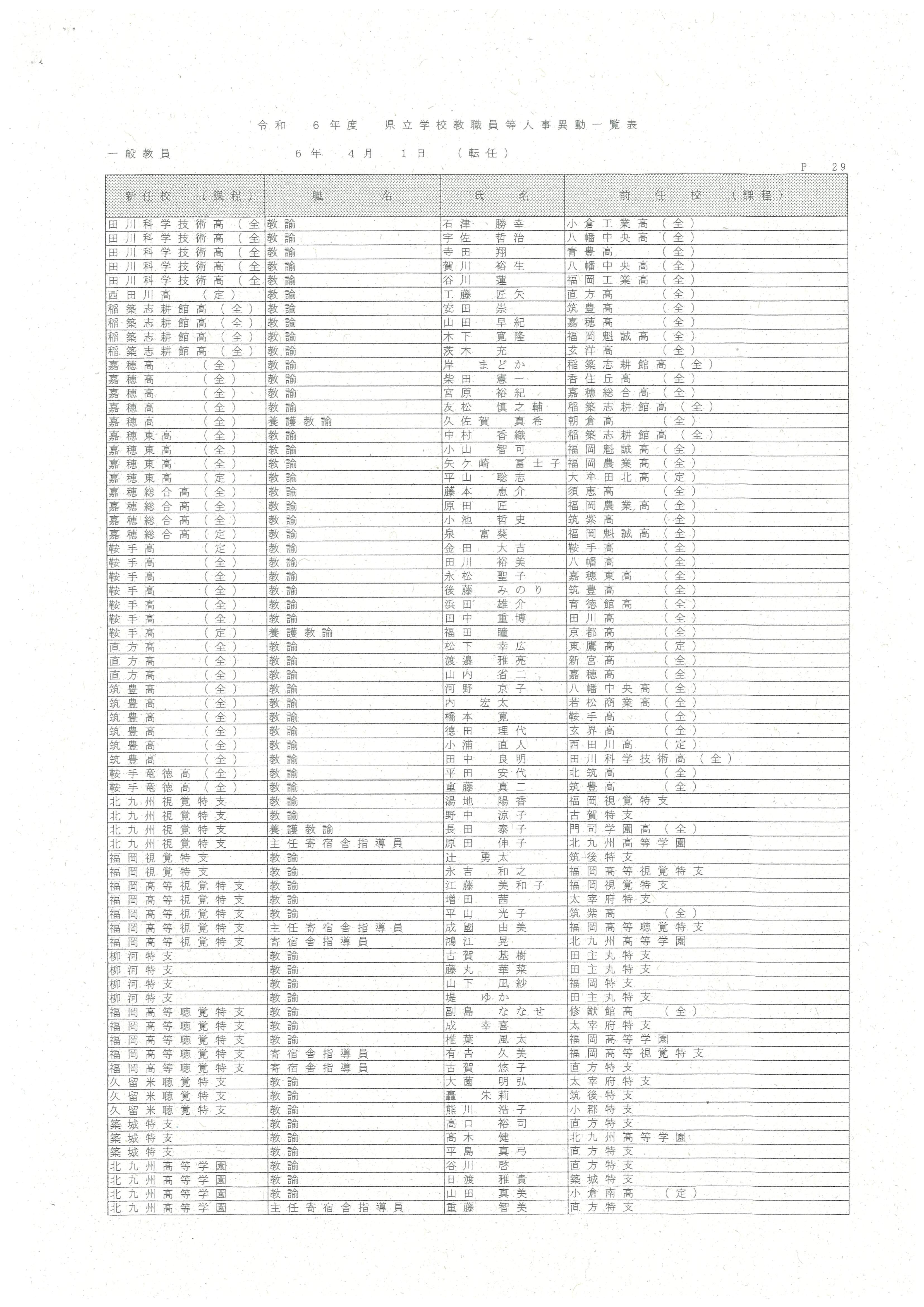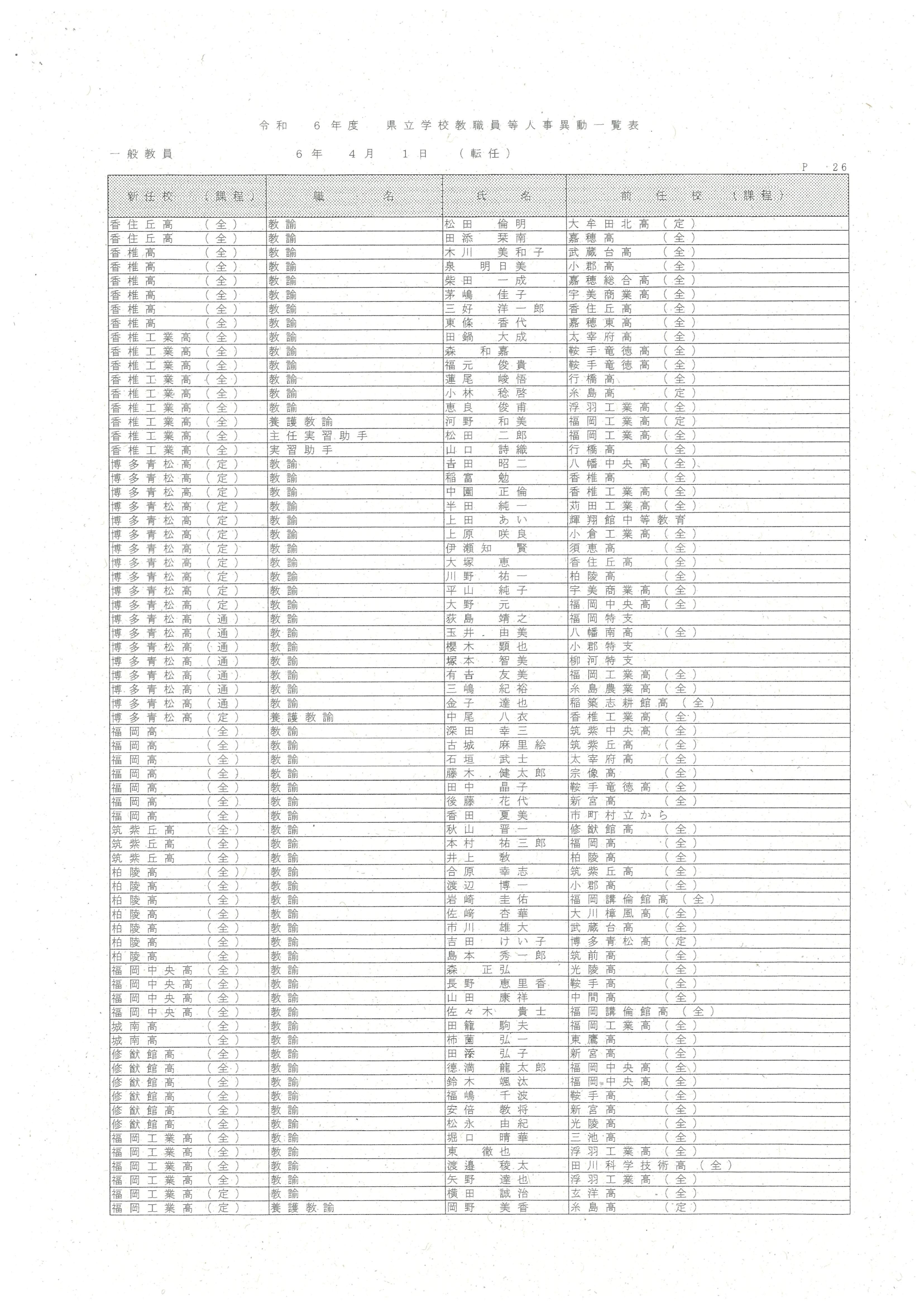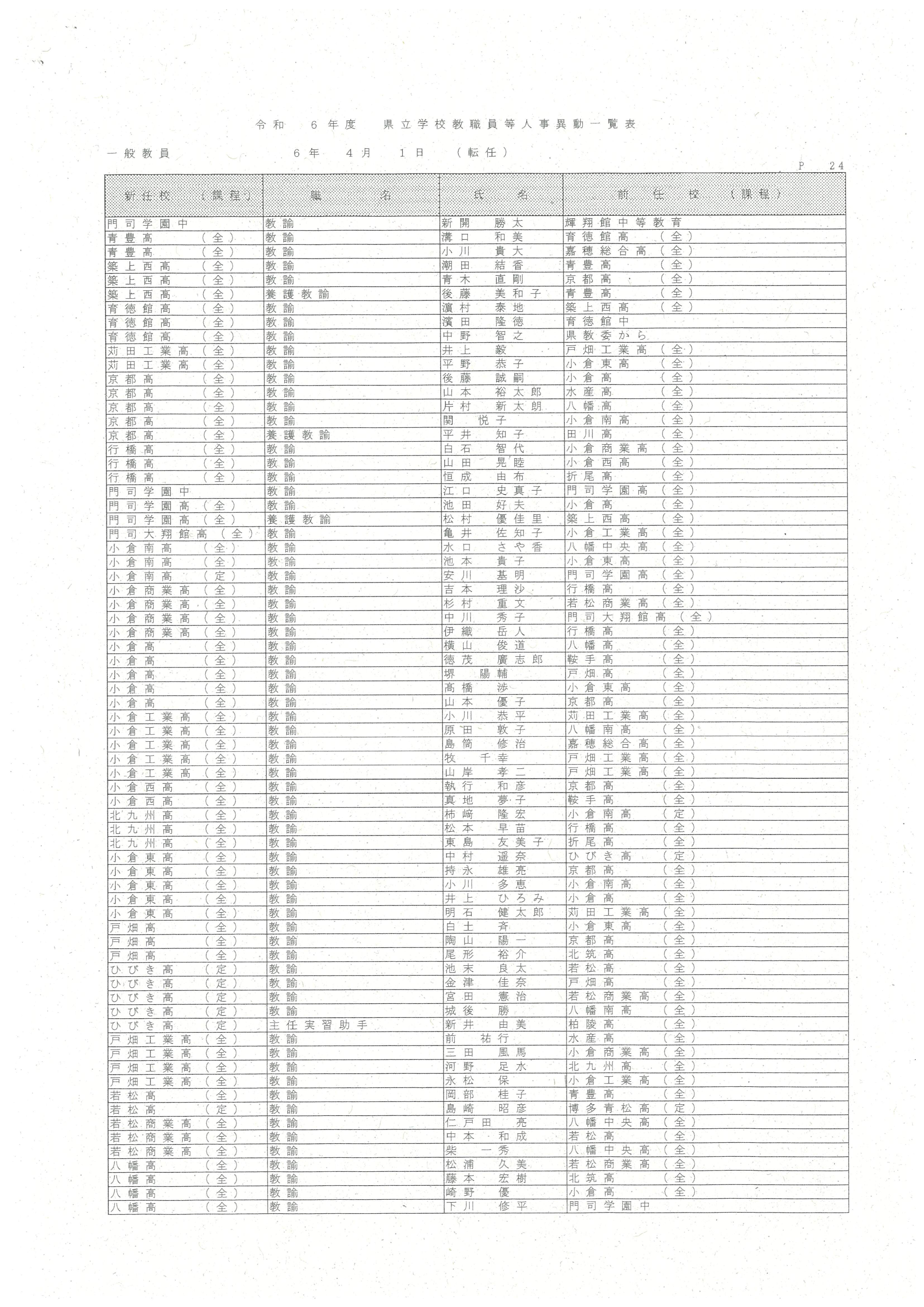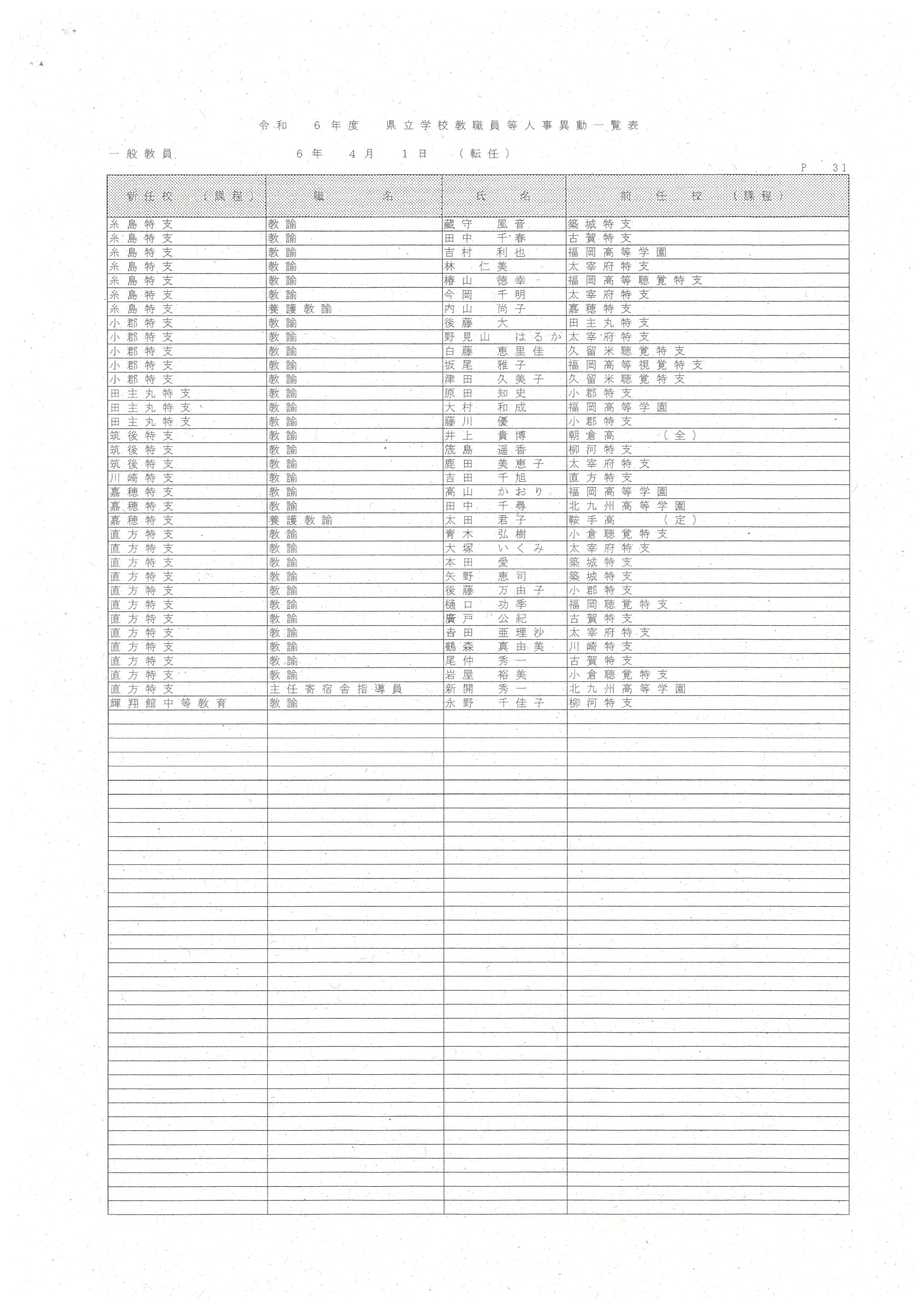 福岡県教職員人事異動2024「あの先生は今どこに?」 小学校・中学校・高校・特別支援学校【全件掲載】 RKB毎日放送 2024年4月1日(月) 00:00 国内 ◆県立学校(高校・特別支援学校など)② 以上。 ◆その他リンク ▼福岡市教職員人事異動2024【全件掲載】 ▼北九州市教職員人事異動2024【全件掲載】 ▼佐賀県教職員人事異動2024【全件掲載】