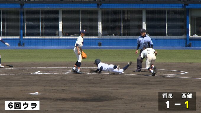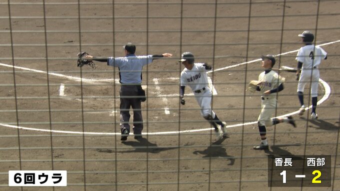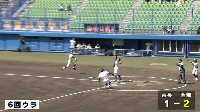 3塁ランナーをホームでアウトにしようとした、香長のピッチャー岡本琥之介(2年)が悪送球。西部はこの回、“ノーヒット”で逆転に成功します。