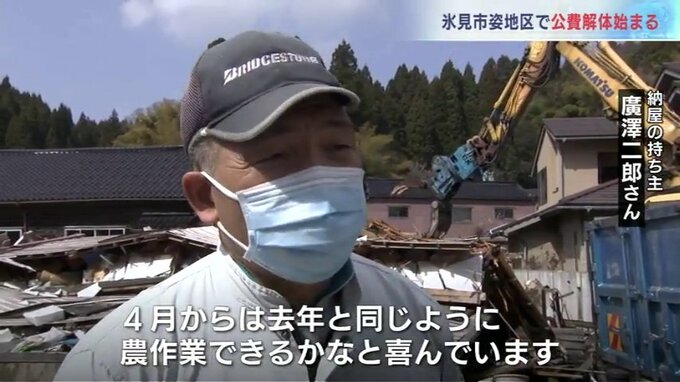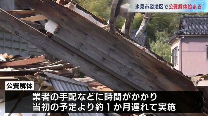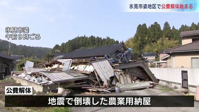 公費による解体作業が行われたのは氷見市姿地区にある農業用の納屋です。ことし元日の地震で倒壊した納屋の屋根などが道路をふさいでいたため、緊急な対応が必要とされていましたが、業者の手配などに時間がかかり、当初の予定よりおよそ1か月遅れて解体が始まりました。
