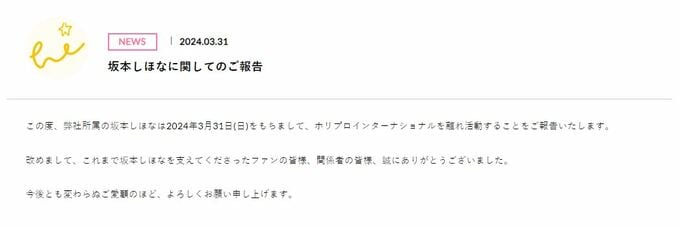 公式サイトで「この度、弊社所属の坂本しほなは2024年3月31日(日)をもちまして、ホリプロインターナショナルを離れ活動することをご報告いたします。」と知らせ、「改めまして、これまで坂本しほなを支えてくださったファンの皆様、関係者の皆様、誠にありがとうございました。」と感謝を記しています。