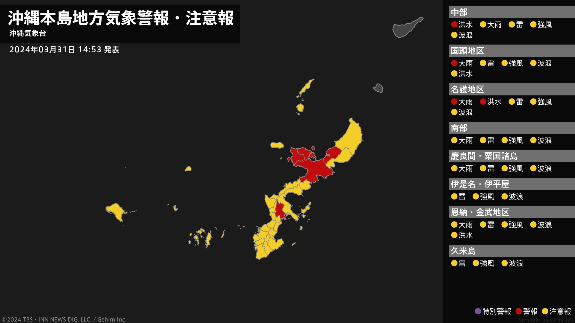 気象台は、午後2時53分に、大雨警報(浸水害)を名護市に発表しました。