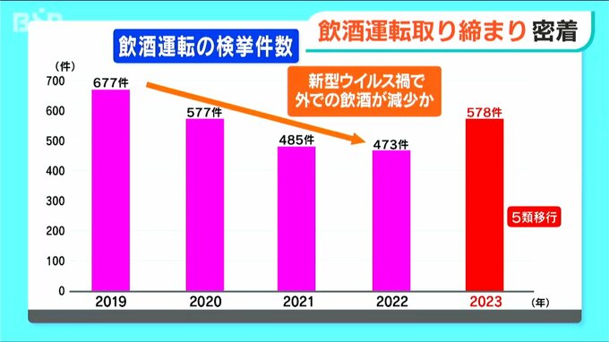 しかし、新型コロナウイルスの感染症法の位置付けが5類に移行し、酒気帯び運転などで検挙された人の数が2023年から増加傾向にあります。