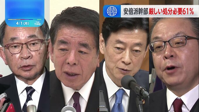 自民党の裏金事件をめぐり、先週新たに聞き取りが行われた安倍派幹部4人の処分について、「除名」や「離党勧告」といった厳しい処分が必要と答えた人が61%にのぼることが最新のJNNの世論調査でわかりました。岸田…