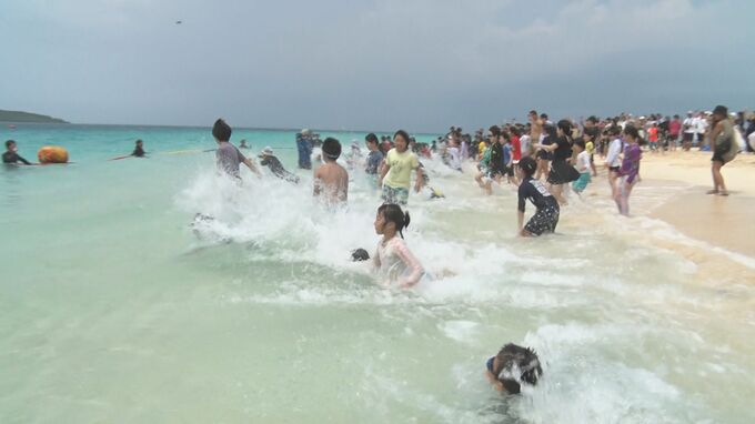 宮古島市・与那覇前浜ビーチではセレモニーが行われ、太鼓の演舞などで海開きを盛り上げると、子どもたちが一斉に海に駆け込みました。