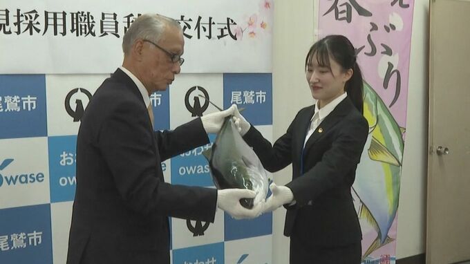 三重県尾鷲市役所では、新たに採用された市の職員に「市の魚」に指定されている「ブリ」が手渡され…