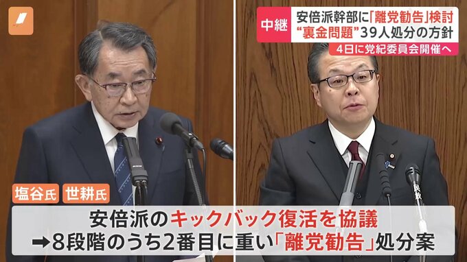 自民党の派閥の裏金事件、処分に向けた動きが進んでいます。茂木幹事長が会見し、39人を処分の対象とすることを明らかにしました。配布された紙には対象となる議員の名前が並んでいますが、二階元幹事長や岸田総理…