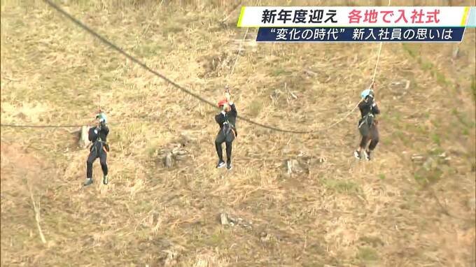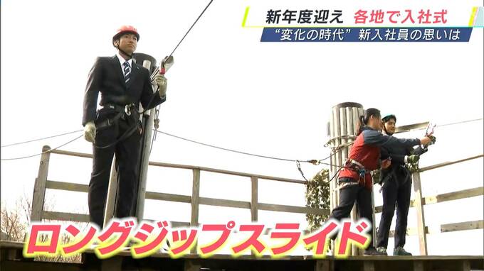 真新しいスーツ姿に体を固定するハーネス、そしてヘルメット。静岡県三島市の「三島スカイウォーク」を運営する「フジコー」の新入社員9人です。外国人観光客も徐々に増える中での入社。人気の「ロングジップスライド」に乗って意気込みを発表します。