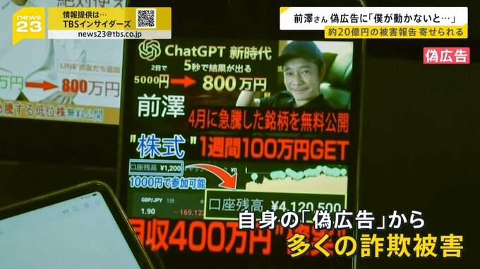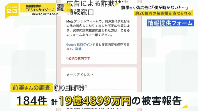 news23で継続して追及している有名人の写真や名前を無断で使用する「偽広告」の問題。なりすましの被害を訴える実業家の前澤友作さんが番組のインタビューに応じ、「偽広告」を掲載するプラットフォーム側に対し法的措置を検討している事も明らかにしました。
