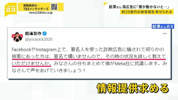 3月、前澤さんはSNSで有名人になりすました偽広告の被害にあった人に情報提供を求めました。