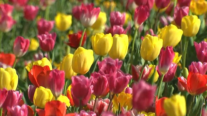 丸亀市のレオマリゾートで約7万本のチューリップが見ごろを迎え、訪れる人を楽しませています。赤、黄、ピンク。色とりどりの花が一面に咲き誇ります。レオマリゾートの中にあるオリエンタルトリップのフラワーガ…