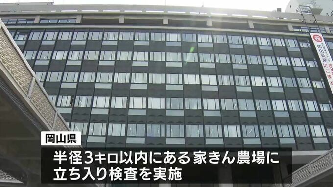 環境省は回収場所から半径10キロ以内を野鳥監視重点区域に指定しました。半径3キロ以内には家きん農場が1戸あり、岡山県はきょう(2日)立ち入り検査を行うとともに、県内全ての家きん農場に衛生管理の徹底を要請しました。