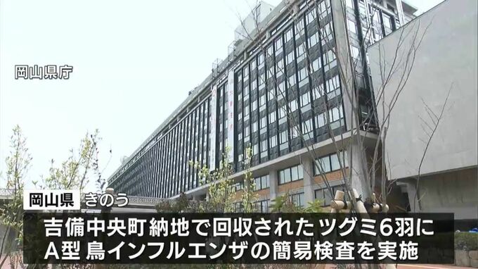 岡山県によりますと、きのう(1日)、吉備中央町納地で回収されたツグミ6羽にA型鳥インフルエンザの簡易検査を実施したところ、うち1羽で陽性反応が確認されました。採取された試料はきょう(2日)国に送られ、1週間程度で確定検査の結果が出るということです。