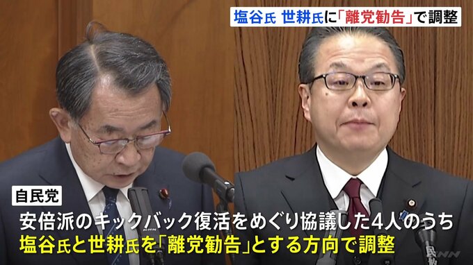派閥の裏金事件を受け、自民党は塩谷元文科大臣と世耕前参院幹事長を「離党勧告」の処分とする方向で調整に入りました。派閥の裏金事件を受け、自民党は安倍派と二階派の議員ら39人を処分する方針ですが、安倍派の…