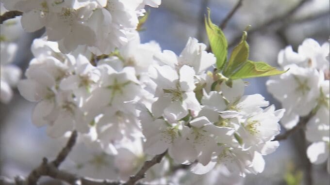 「葉っぱと花が同時に咲いて、葉っぱの中に白い桜が溶け込んでいる桜です」