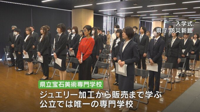 山梨県の地場産業ジュエリーのデザインや加工などを学ぶ県立宝石美術専門学校の入学式が、甲府市で行われました。