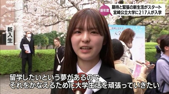 期待と緊張の新生活が始まります。宮崎公立大学で入学式が行われ、新入生たちが大学生活の一歩を踏み出しました。宮崎公立大学には今年度、人文学部国際文化学科に新入生217人が入学しました。入学式では、辻利則…