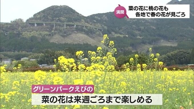 春を彩る花の話題です。この時期、桜もきれいに咲いていますが、宮崎県内各地で菜の花や桃の花も見ごろを迎え、春の訪れを感じさせています。こちらは、えびの市にある「グリーンパークえびの」。一面、黄色のじゅ…