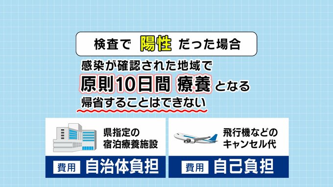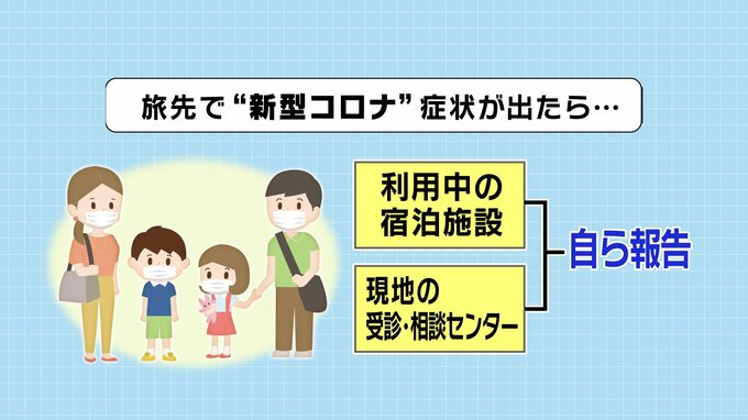 旅先で新型コロナの疑いが出た場合、利用中の宿泊施設や現地の相談センターに自分で報告することになっています。陽性となった場合、その地域で原則10日間、療養となるため帰省することはできません。