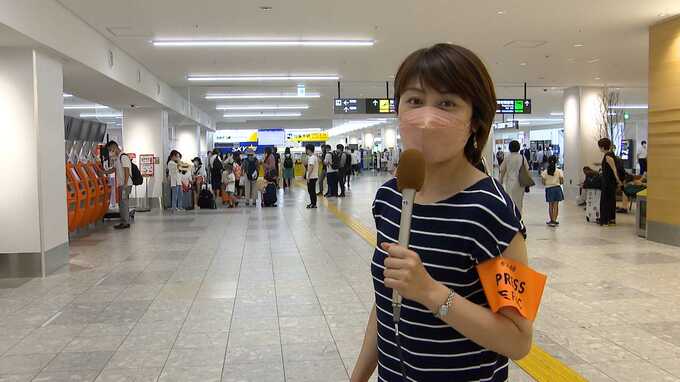 RKB堤千春「福岡空港の1階ロビーです。スーツケースや旅行バッグを手にした人たちの姿が多く見られます。感染対策は、どのようにしているのでしょうか」