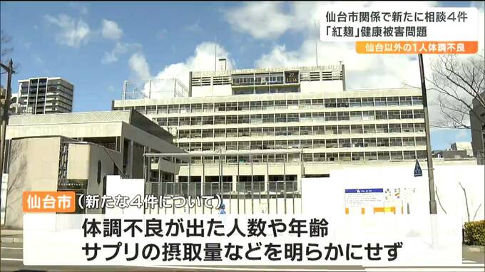 小林製薬の「紅麹」を使ったサプリメントを摂取した人に健康被害が相次いでいる問題で、新たに仙台市の人が関係するとみられる相談が4件寄せられたことが分かりました。また、仙台市以外の1人が体調不良を訴えていたこともわかりました。