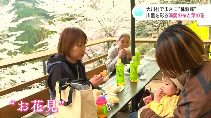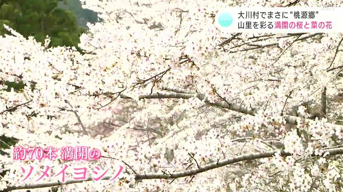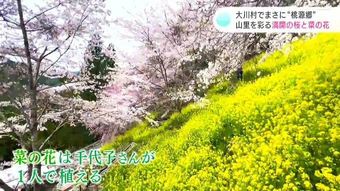 「大川村の山奥、井野川地区に来ています。緑が広がる山の中ですが、こちら、一面に菜の花とサクラが咲き誇っています。きれいな光景、まさに“桃源郷”です」