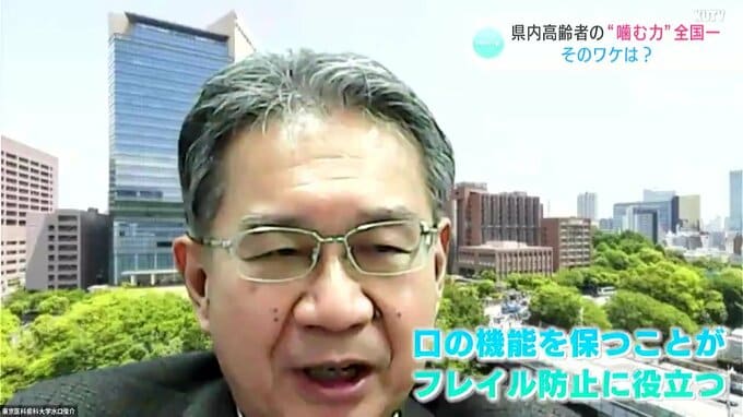 また、「噛む力」を保つことでメリットも多いと考えられています。口の機能と栄養状態に関する研究などを行う東京医科歯科大学の水口俊介(みなくち・しゅんすけ)教授は、口の機能を保つことが体全体や心の衰え=フレイルを防止するのに役立つと話します。