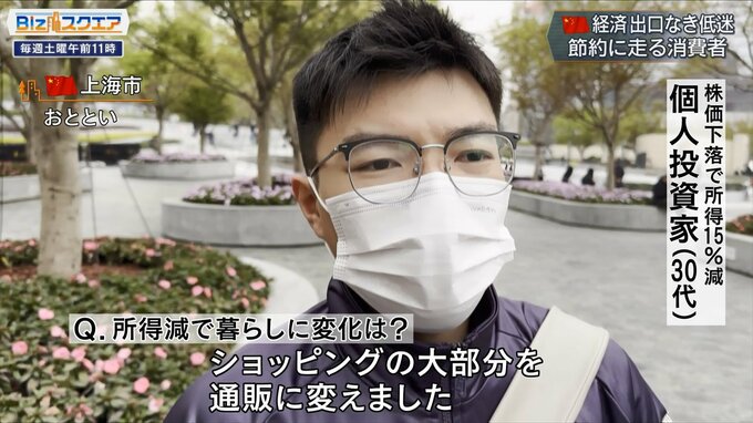 節約志向が強まる中国。株価の下落で所得が15%減ったという30代の個人投資家に暮らしの変化を聞くと「ショッピングの大部分を通販に変えた。買い物に行くと交通費がかかるし、店の値づけの変動の影響も受けて、結果的に高い買い物をしていることに気づいた。通販ならそういうストレスもなく届けてくれる大事なポイント」という。