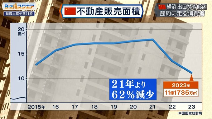 消費が振るわない原因は、長引く不動産不況。中国の新築住宅販売は下落を続け、2023年はピークだった2021年から62%減少。不動産開発会社の相次ぐ経営危機で建設がストップ。社会不安が増大したためだ。