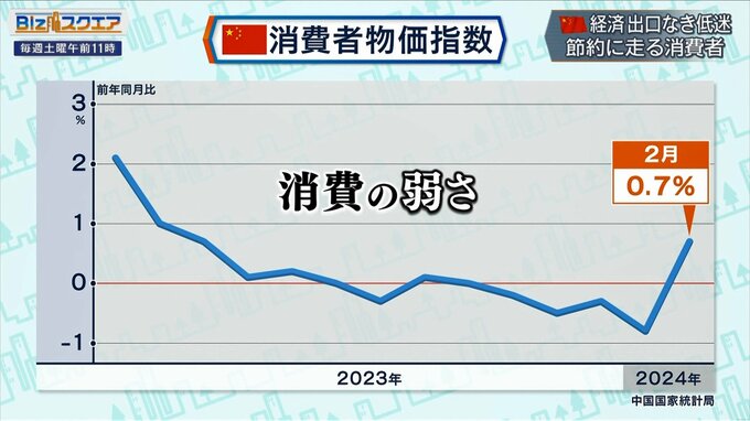 中国の消費者物価指数は春節効果があった直近の2月を除き、2023年10月から4か月連続のマイナス圏で消費の弱さが顕著になっている。