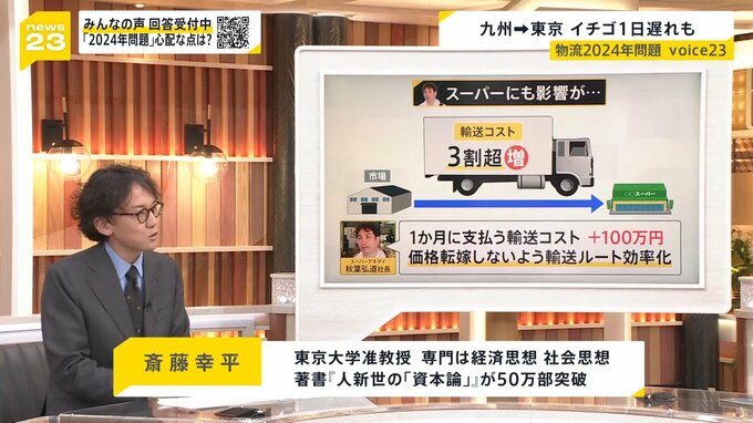 イチゴを店頭に並べるスーパーマーケットにも大きな影響が出るそうで、実は輸送コストは3割以上も増える見込みだそうです。