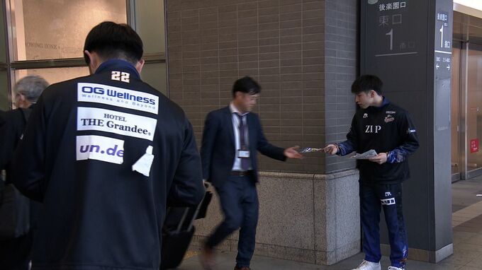 バスケットボールB3リーグのトライフープ岡山が最終戦を前にJR岡山駅で来場を呼びかけました。通勤客が行きかう岡山駅前、選手やスタッフ6人が約1000枚のチラシを配りました。トライフープは現在のB3よりも上位の…
