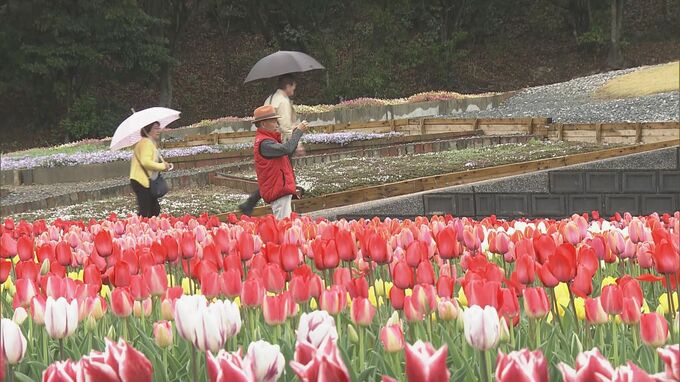 雨の中、色鮮やかなチューリップが見頃を迎えています。