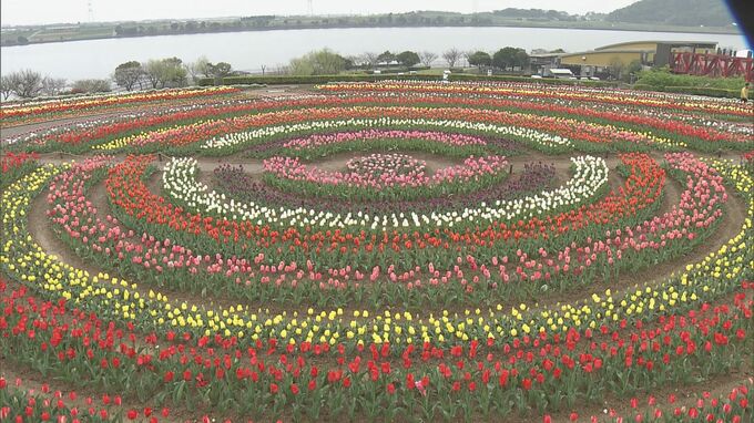 ひときわ目を引くのは直径25メートルの円形の花壇で、約1万4000本のチューリップが来場者を楽しませています。