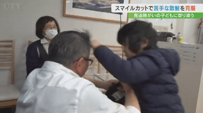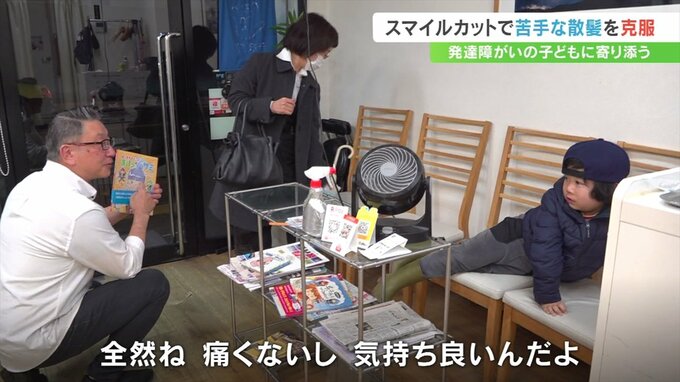 散髪を嫌がるしゅうさんに穏やかな口調で呼びかける千野さん。