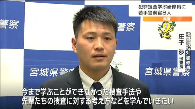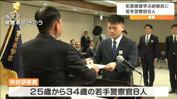 取り調べや聞き込みといった犯罪捜査の実践的な技術を学ぶ宮城県警の特別研修員に若手警察官から8人が選ばれ、2日、指定式が行われました。選ばれたのは25歳から34歳で、原幸太郎本部長から指定書を受け取りました。