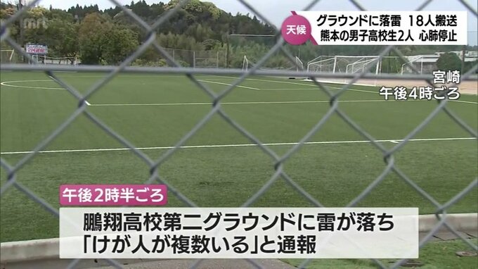 警察や消防によりますと、3日午後2時半ごろ、宮崎市の鵬翔高校の第二グラウンドに雷が落ち、けが人が複数いると学校関係者から通報がありました。