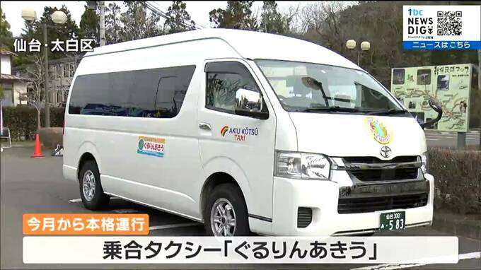 仙台市太白区の秋保地区で4月から運行が始まったのは、乗合タクシー「ぐるりんあきう」です。利用は秋保地区内で予約をすれば自宅などから目的地まで、ドアトゥードアで行くことができます。秋保地区は、路線バスの本数が少なく、交通の便の悪い状況が続いていました。このため昨年度、乗合タクシーの実証運行を行った結果、4237人が利用し、本格運行となりました。