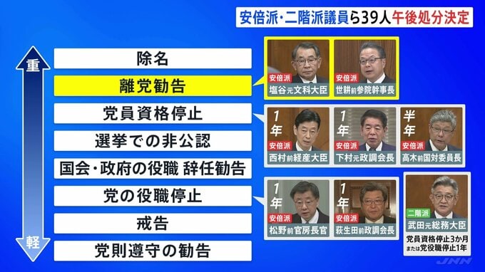 派閥の裏金事件を受け、自民党は午後、党紀委員会を開き、安倍派や二階派の議員ら39人の処分を決定します。複数の関係者によりますと、処分は安倍派のキックバックの復活をめぐり協議した4人の幹部のうち、▼派閥…